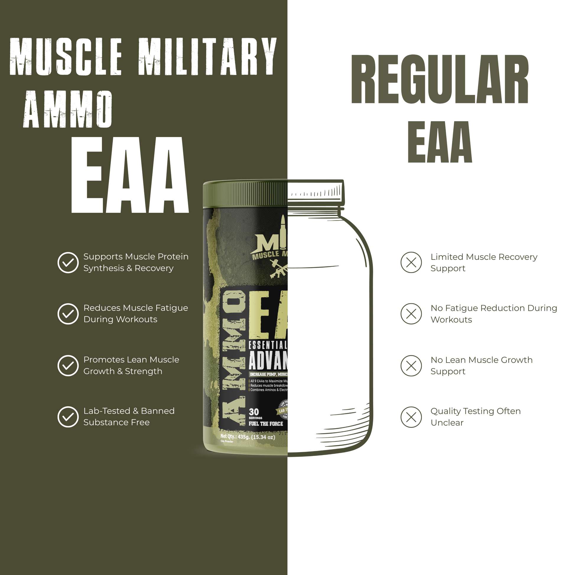 Muscle Military Ammo EAA is a premium essential amino acid supplement designed to support muscle recovery, endurance, hydration, and workout performance. EAAs include all nine essential amino acids that the body cannot produce on its own, making Ammo EAA an effective choice for athletes who want faster recovery, reduced muscle breakdown, and improved training output.