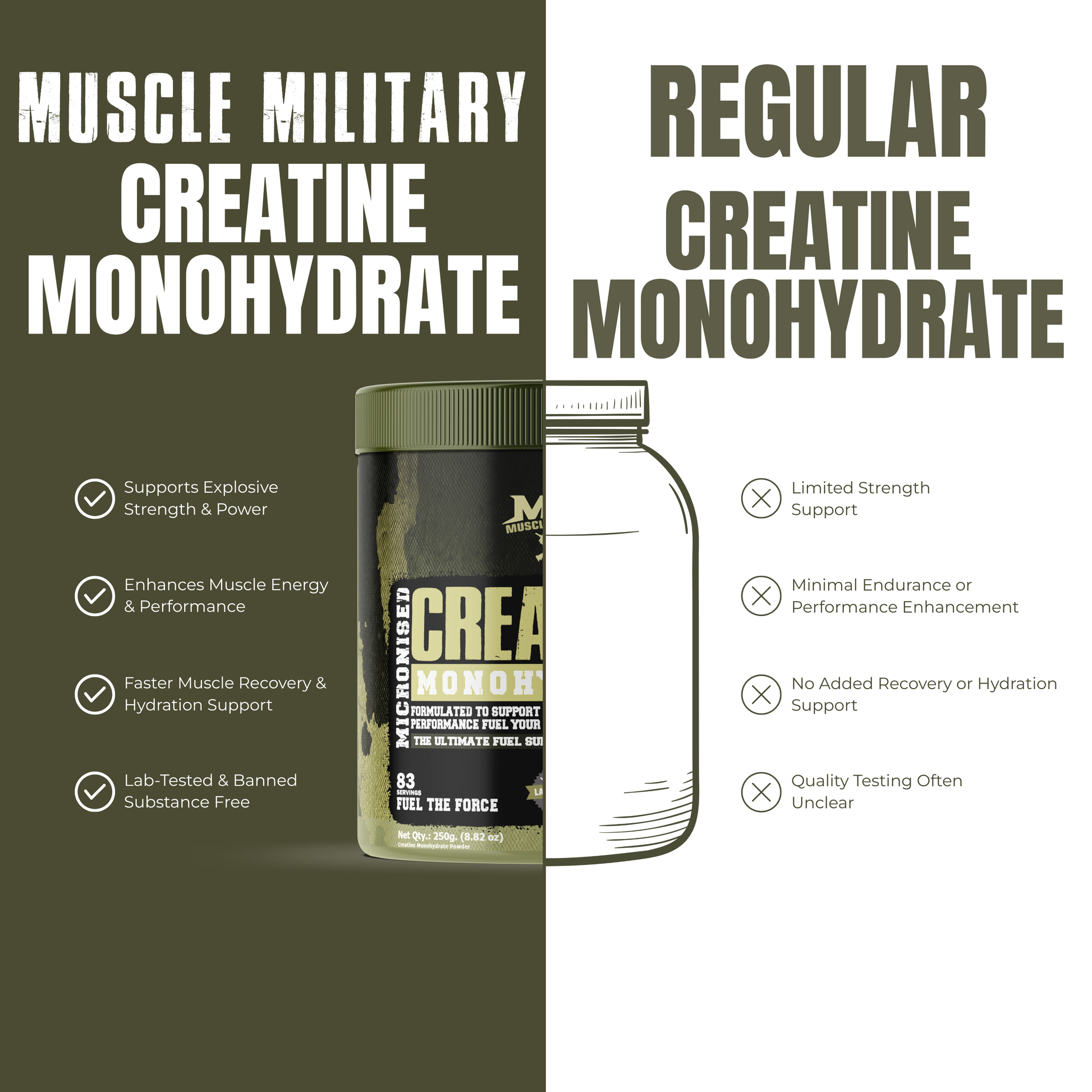 Muscle Military Creatine Monohydrate is a high-purity performance supplement that supports strength, power, and muscle growth. Creatine helps increase ATP production in muscles, allowing you to lift heavier, train harder, and perform more reps during high-intensity workouts. It is one of the most researched and trusted supplements for athletes and fitness enthusiasts.