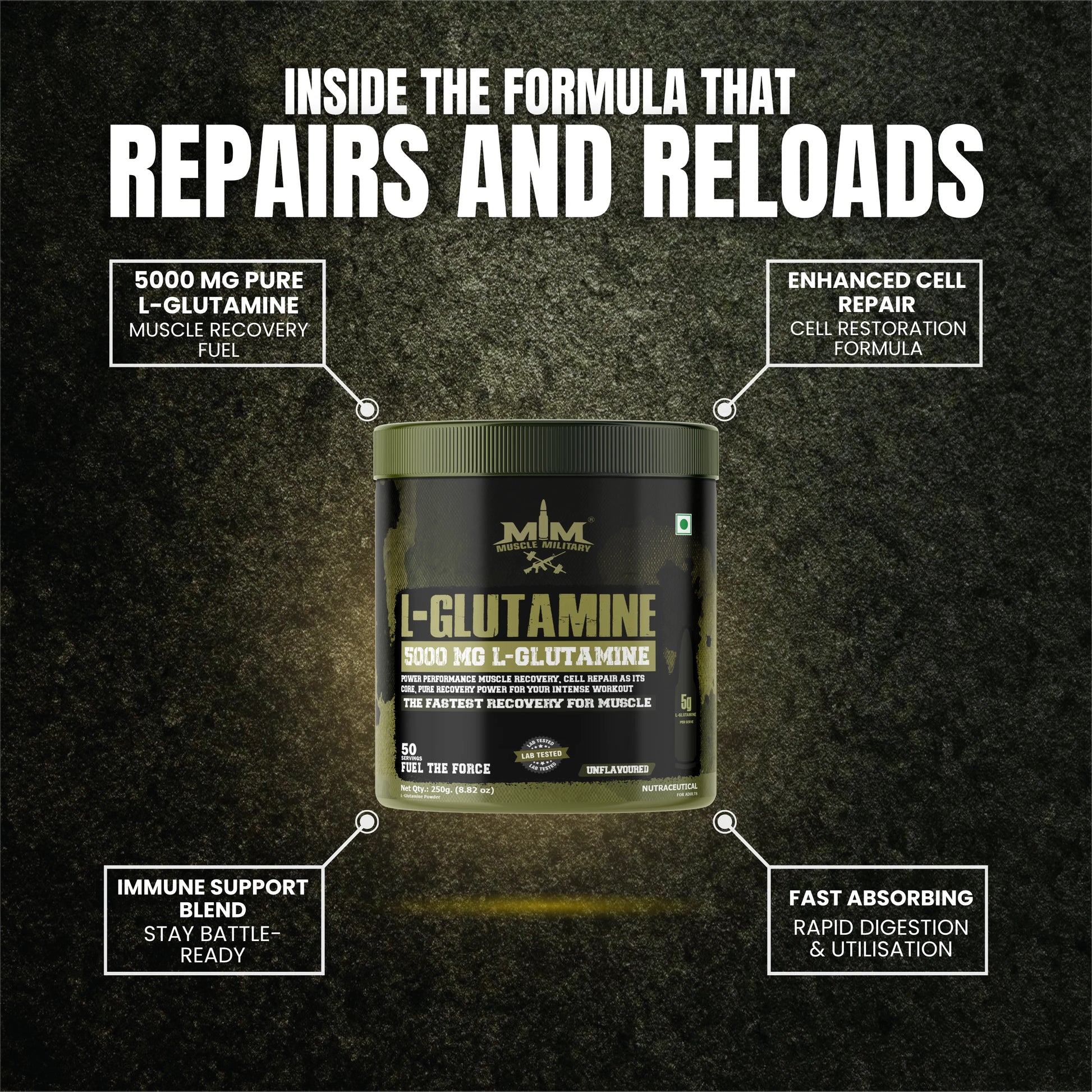 "Formulated for performance-focused individuals, Muscle Military L-Glutamine delivers clean, micronized support for active lifestyles. Designed to complement your training routine and daily nutrition goals."